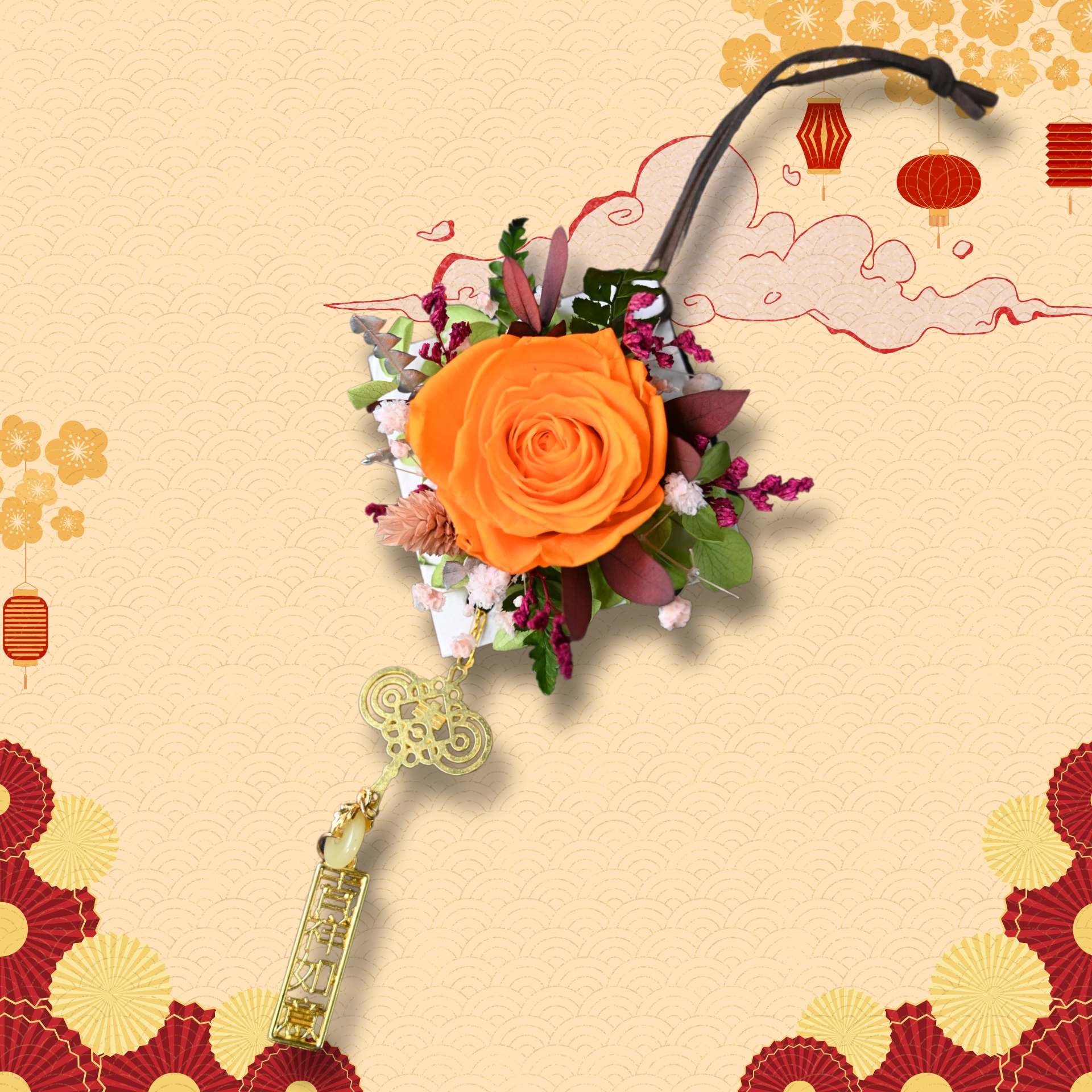 利用再生紙與保鮮花結合,製作成吊掛的裝飾物